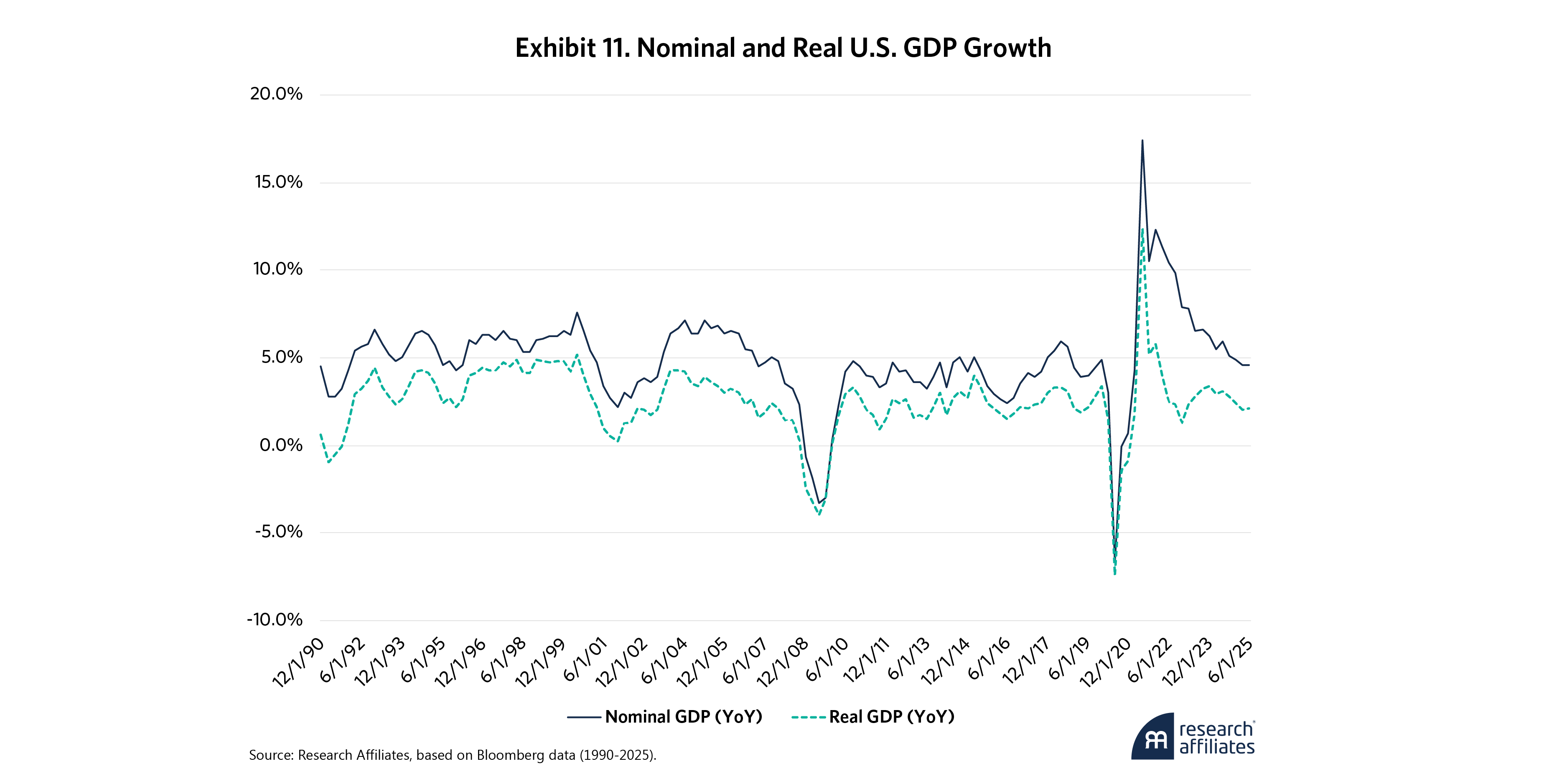 Exhibit 11 shows that while real growth averaged a little more than 3% per year for many decades after World War II, from 2015 to 2024, it fell to the low 2% range. The COVID-19 pandemic led to a deep decline in 2020 and a strong rebound in 2021 before settling back toward pre-pandemic norms.