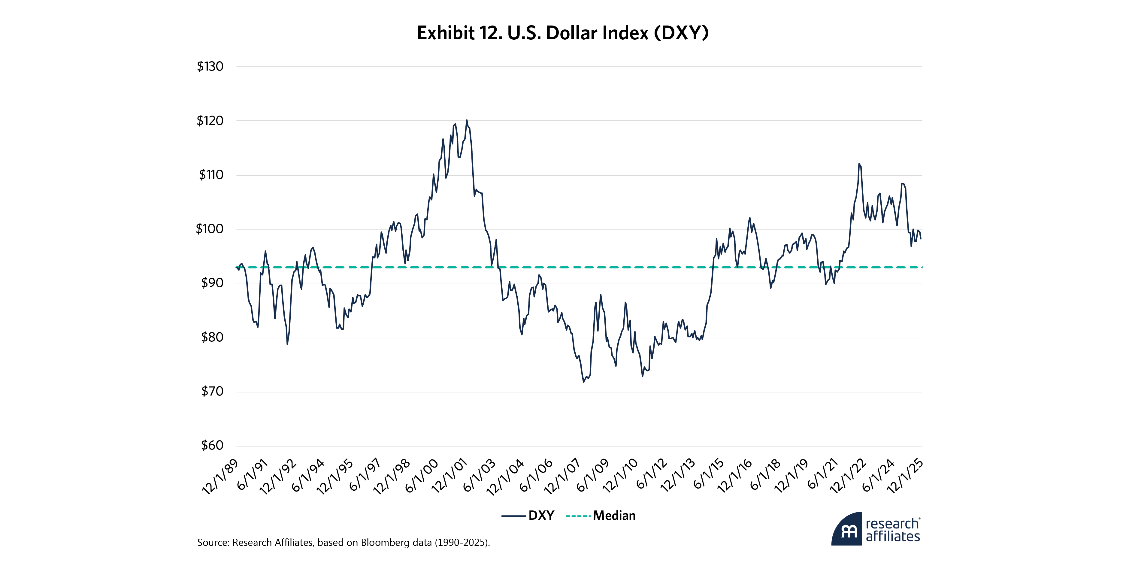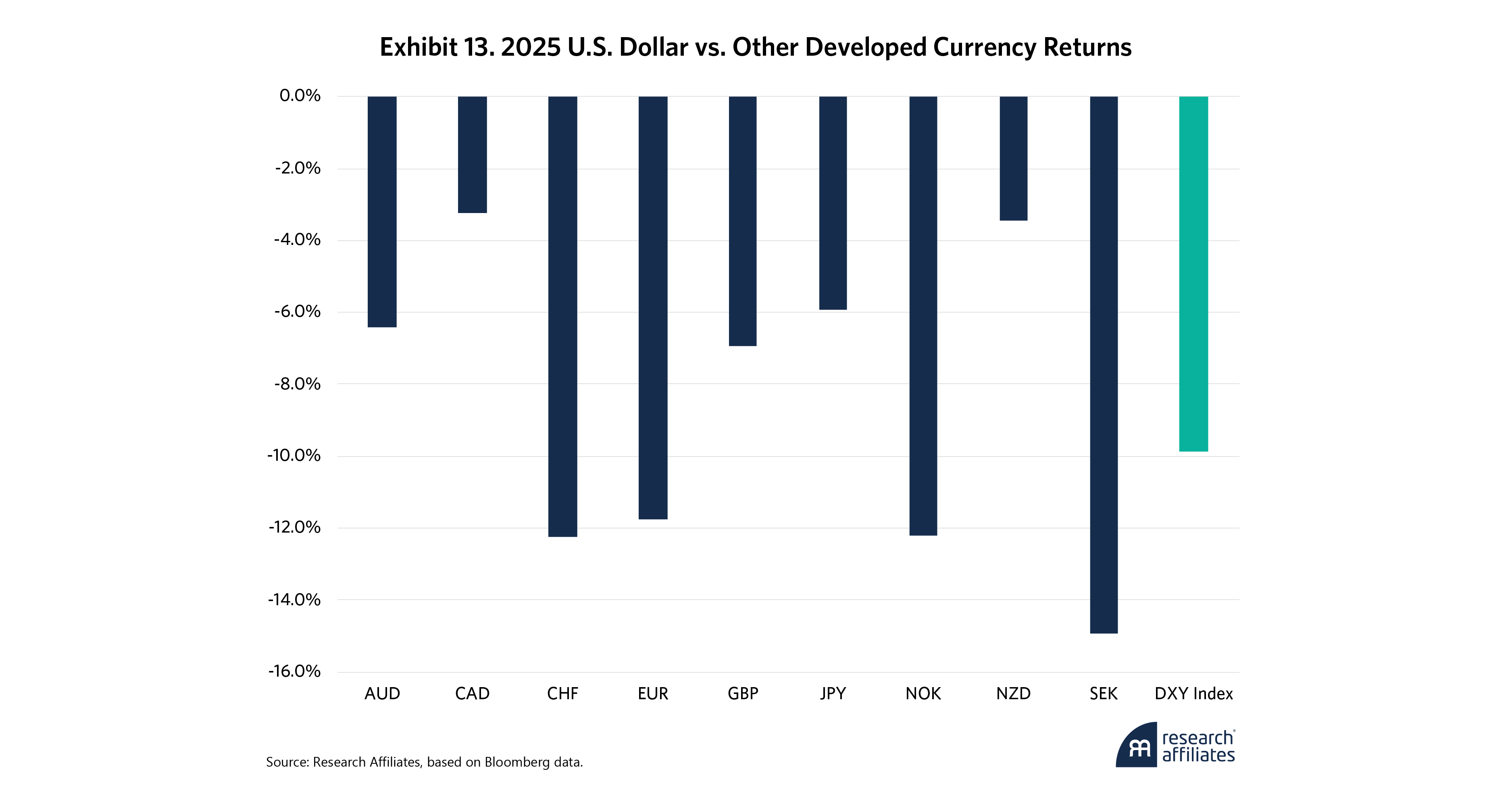 Between the U.S. election in early November 2024 and January 1, 2025, the tariff narrative took center stage. Reduced U.S. imports would strengthen the U.S. dollar due to altered supply-and-demand dynamics. That didn’t play out. The dollar weakened almost from the outset, as Exhibit 12 shows. That process actually began in late 2022, a time when our models indicated significant overvaluation (Masturzo, 2023), but paused until last year.