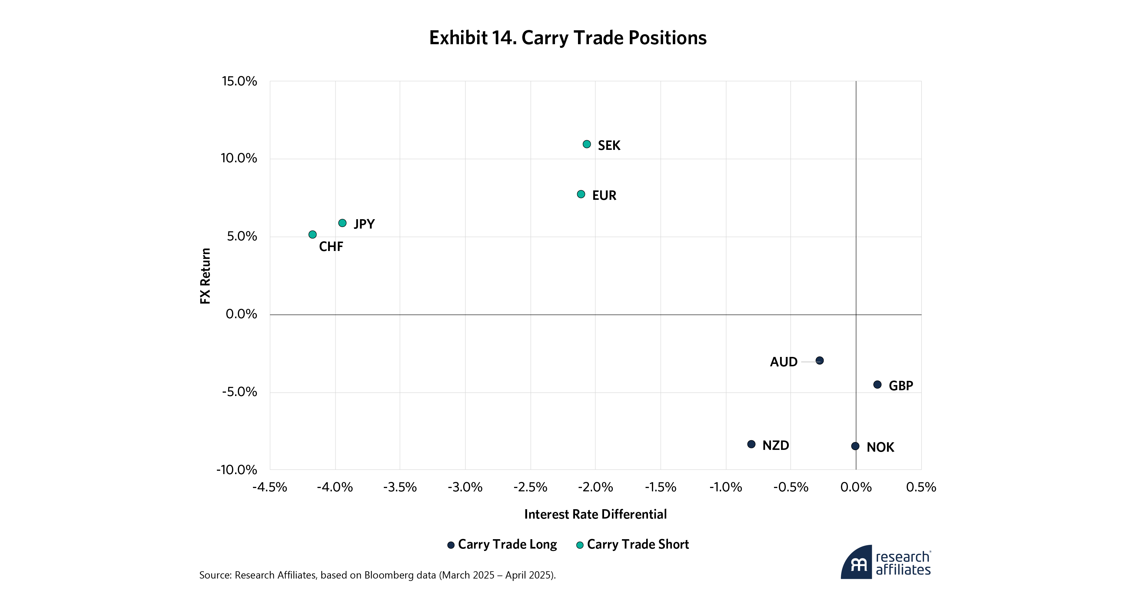 But this year, FX rates moved materially in the opposite direction of the carry trade. Lower-interest-rate countries saw FX appreciation against their higher-interest-rate peers. Carry traders went from years of picking up a wealth of pennies in front of the proverbial steamroller to meeting the steamroller. As an example of the losses, Exhibit 14 shows each country’s interest rate differential to the U.S. on the x-axis and each currency’s subsequent FX return along the y-axis during the excessively turbulent months of March and April. Countries with short carry positions are represented by teal dots; positive returns in their currencies add up to losses for carry investors. Countries with long carry positions are indicated by blue dots, and their currencies’ relationship to the carry trade are the opposite of their teal counterparts, that is, positive returns in these currencies translate into gains on the carry trade. In this case both sides of the trade lost, with unlevered carry trade losses of 5% to 10% over the period, but these were often much higher since carry trades are usually meaningfully levered.
