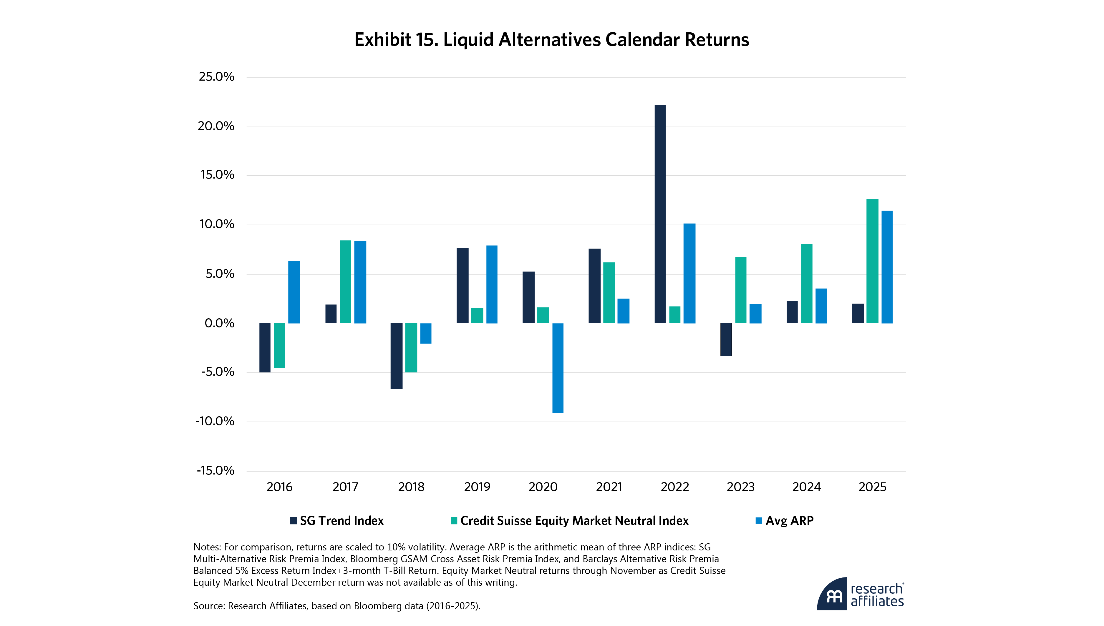 All three were positive in 2025, as Exhibit 15 shows, but their 2021 and 2022 performance, amid peaking inflation and double-digit drawdowns in global stocks and bonds, is probably a more critical consideration. In that tumultuous period, these strategies did their job and provided diversification, a quality that may be even more important if inflation stays hot, and inflation volatility rises.