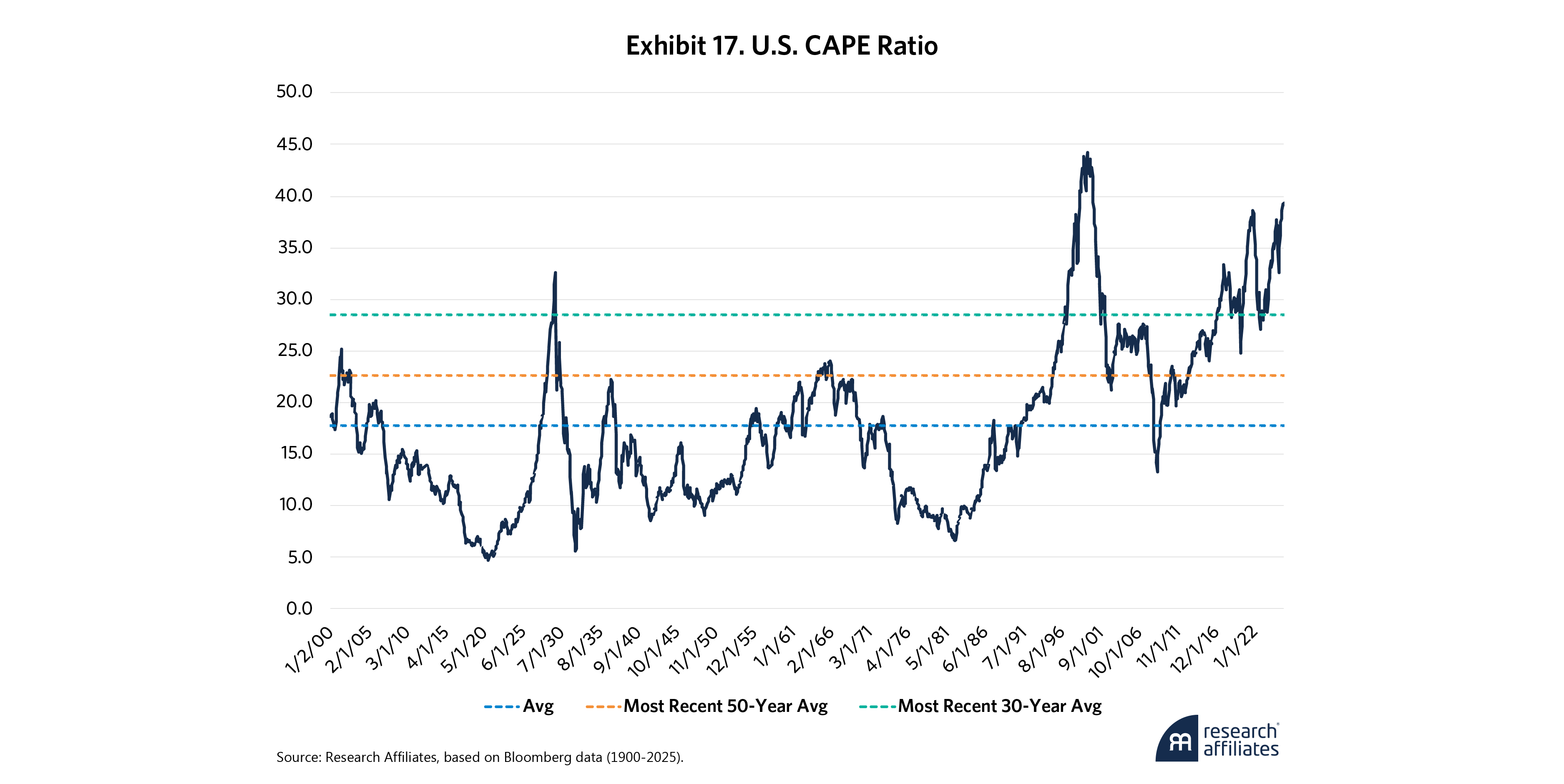 Price appreciation in global equity markets and the U.S. especially did not come with equivalent earnings-per-share (EPS) growth, leading to expensive P/E multiples. The U.S. CAPE is now 40, near its all-time tech bubble high of 44. For comparison, Exhibit 17 shows that the average CAPE since the start of the 20th century and the average 50-year CAPE are about 18 and 22.5, respectively, implying a current overvaluation from those levels of between 43% and 55%. A more conservative 30-year approach that begins in 1995, at the onset of internet commercialization, delivers a fair value of 28. Even that implies a 28% overvaluation. Even if EPS growth corrects for half of that difference, it still leaves a 14% gap for price reductions.