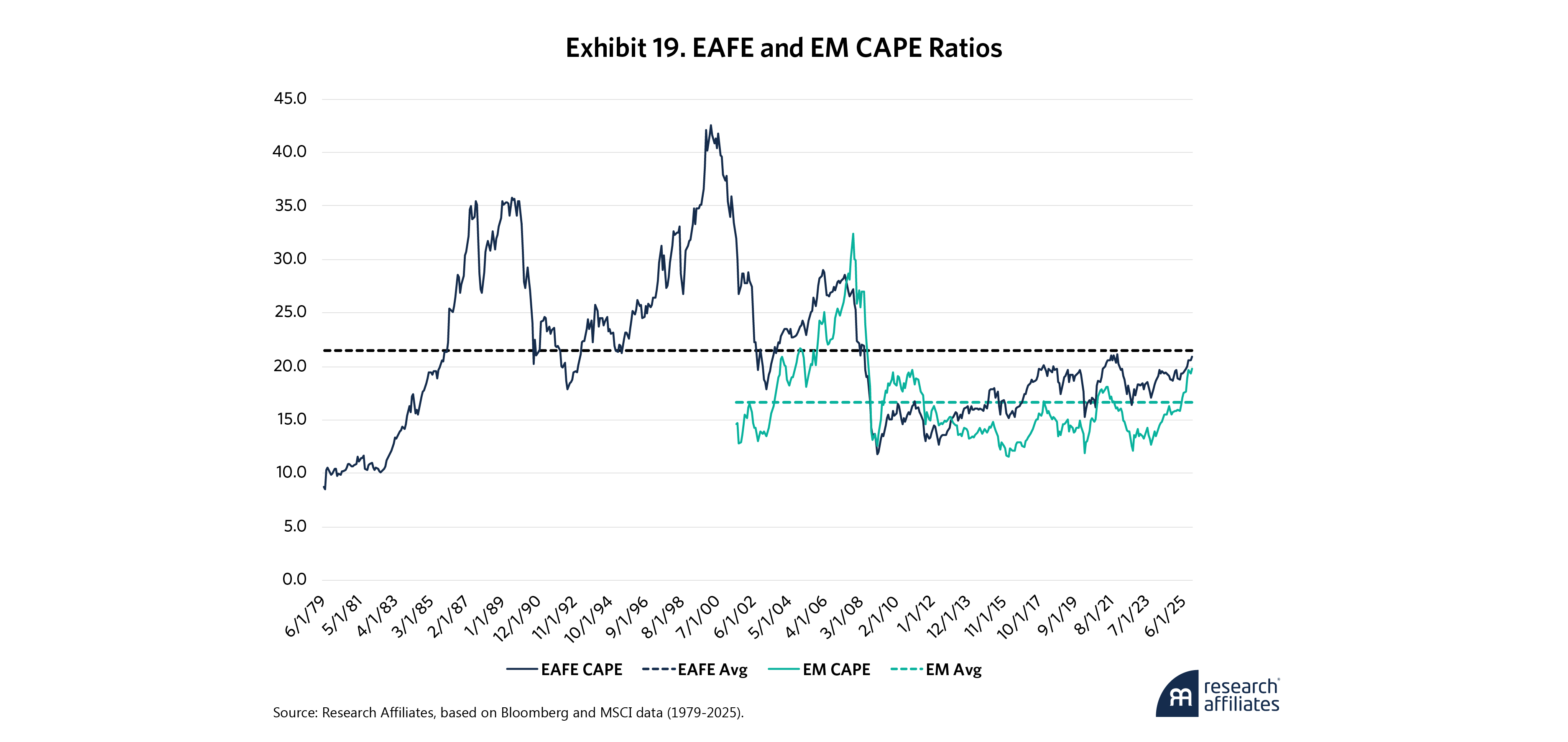 While CAPE and other valuation metrics may help identify when assets or markets are over- or underpriced, they are much less useful in anticipating when mean reversion will occur. With that in mind, we cannot say a U.S. equity crash is imminent, but investors should consider cheaper alternatives, such as developed (EAFE) and emerging markets. As Exhibit 19 shows, EAFE has averaged a 22 CAPE over the last 50 years or so. That indicates a 5% premium compared to its current CAPE of 21. After their 2025 run, emerging markets now trade at around 20, above, but in the neighborhood of, their historical average of 17. At these levels, EAFE and emerging markets have much more attractive fundamentals than U.S. equities.