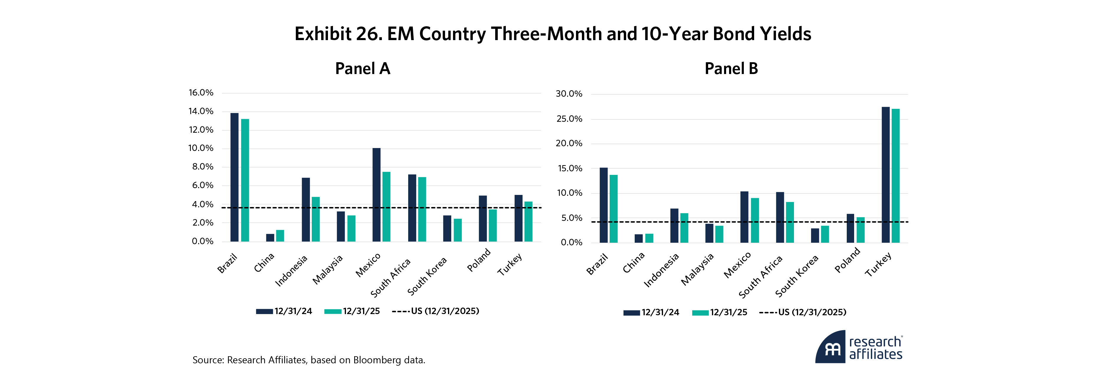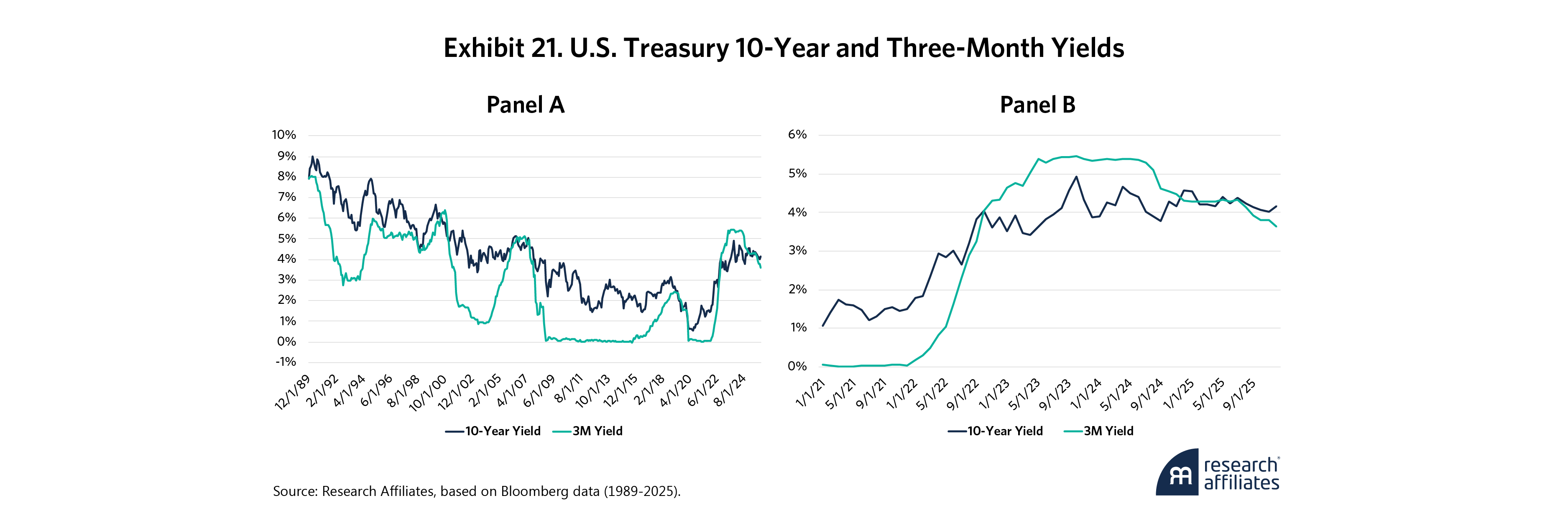 The gloomy U.S. fiscal outlook has led many to expect a dramatic rise in U.S. long-term rates. While this perspective may have some merit, it was not realized in 2025. As Exhibit 21 shows, rates ended the year lower than in January 2025 for the three-month and the 10-year.