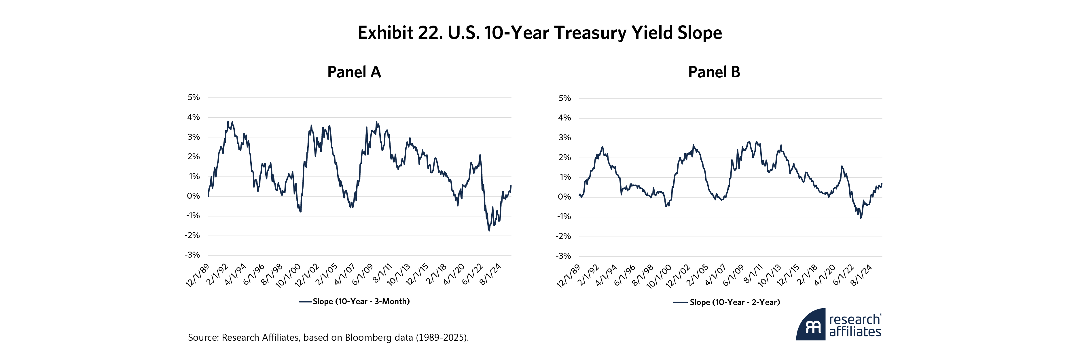 While flat for most of the year, short duration rates have finally fallen below 10-year rates and the yield curve slope is again positive at 50 bps today, as Exhibit 22, Panel A, shows. Historically this slope has averaged 160 bps. The two-year yield, which is less monetary policy-dependent than the three-month, has fallen relative to three-month and 10-year yields, and now has a positive slope at about 70 bps, close to its 80 bps average.