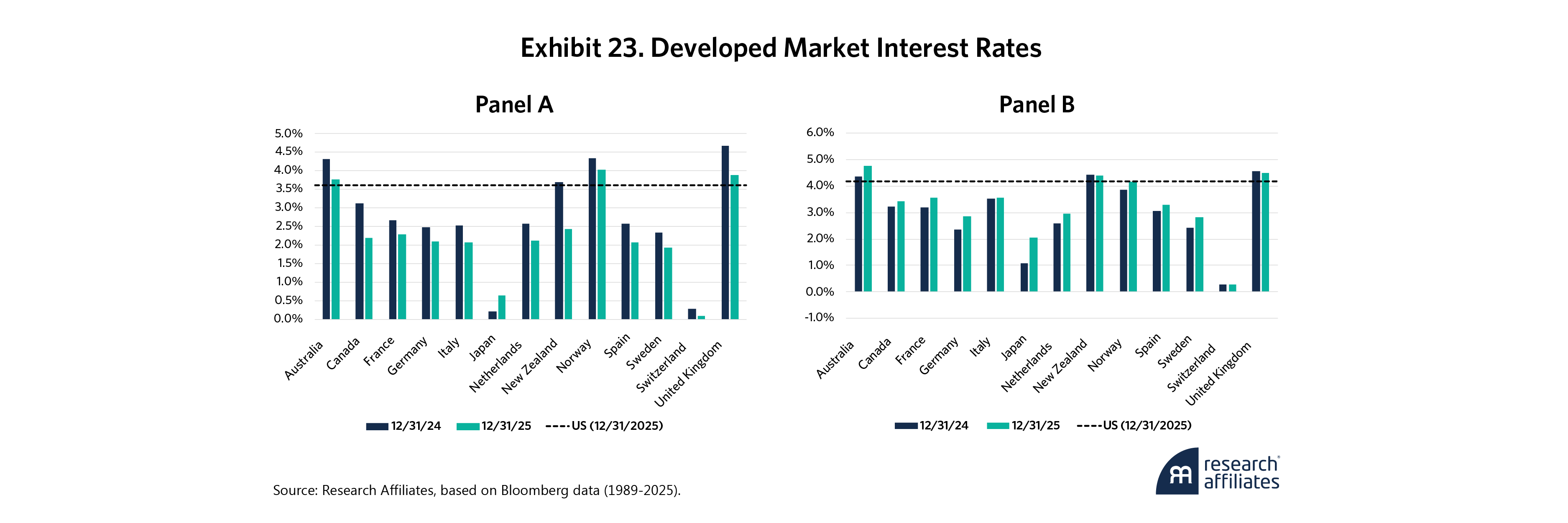 Exhibit 23, Panel A, shows global short rates have fallen around 50 bps on average, and three-month yields are currently lower than those in the U.S. in all developed countries except the U.K., Australia, and Norway. The story is different at the 10-year part of the curve where rates have generally increased during the year, but are still mostly lower than in the U.S.
