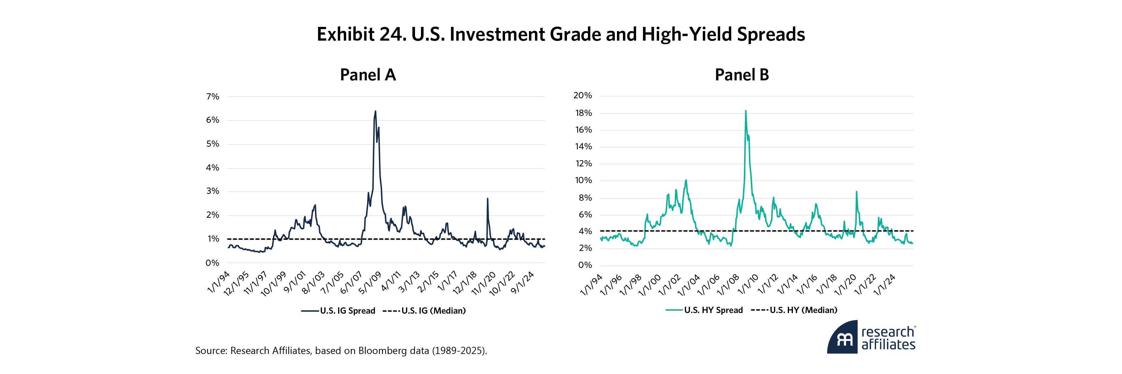 U.S. credit spreads stayed very tight this year, and U.S. high-yield spreads are now in the fifth percentile based on data dating back to 1994, as Exhibit 24, Panel B, shows. But spreads alone can be misleading since issuance has reverted to pre-pandemic levels and thus changed the supply-and-demand mix.