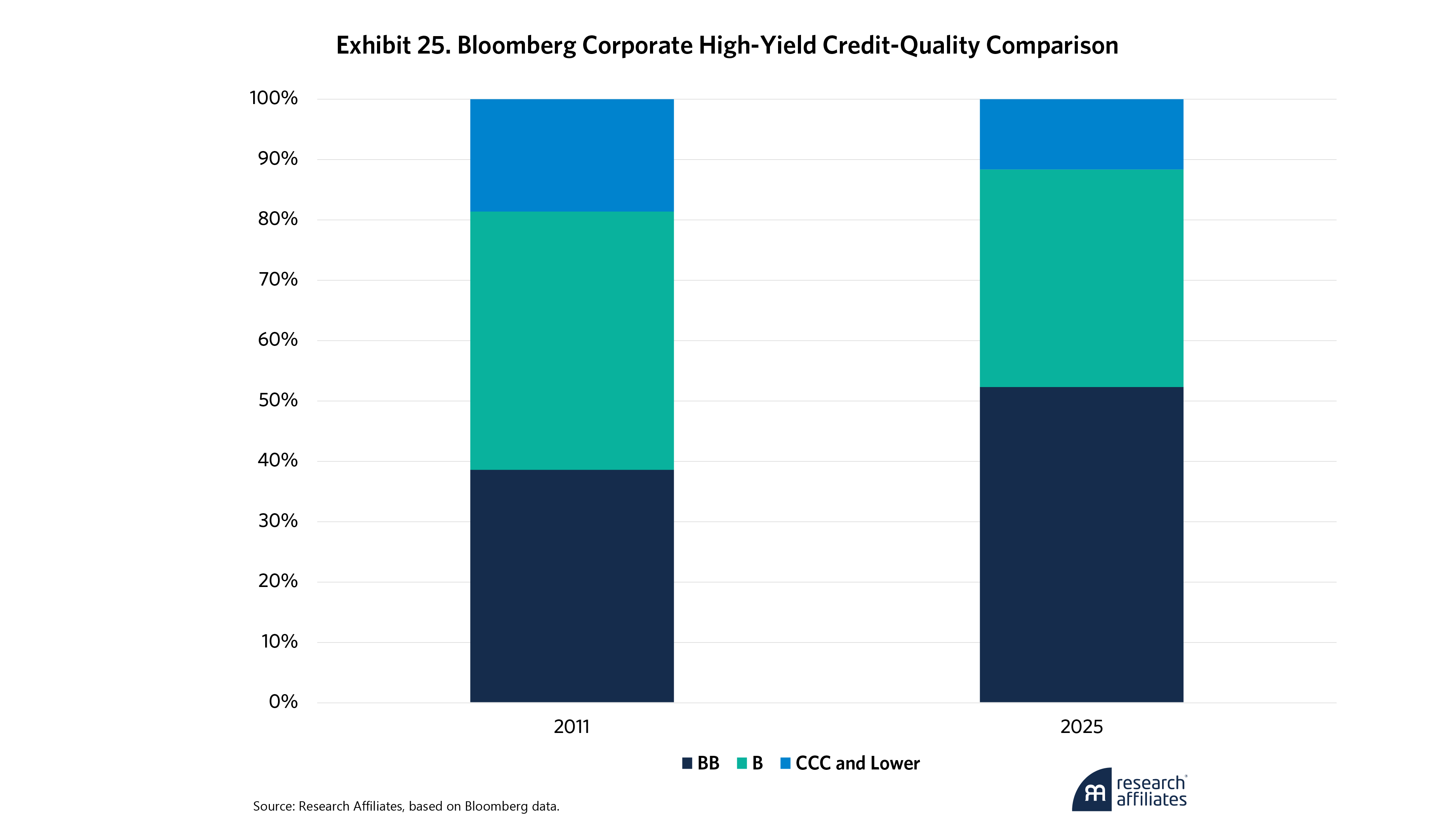 Rising high-yield credit quality is another factor driving tighter spreads, as lower-rated companies have shifted over time to private credit markets. Exhibit 25 shows 15% more of the Bloomberg High Yield Corporate Index is in BB-rated issues than in 2011, while CCC has fallen to just over 10% of the index from almost 20%. Lower expected credit risk has decreased the yield companies are required to pay by investors.