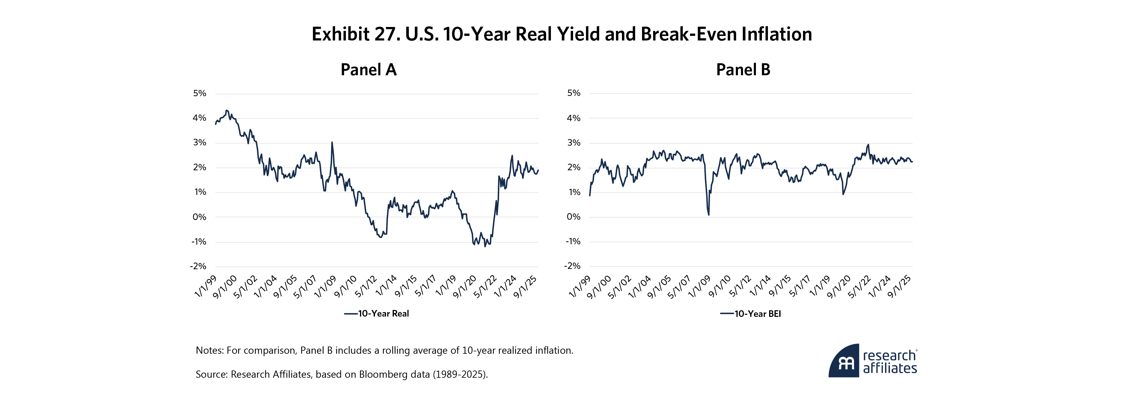 U.S. real interest rates, Exhibit 27, Panel A, echoed changes in nominal rates. As Exhibit 27, Panel B, shows, break-even inflation (BEI) remained stable throughout 2025. BEI, particularly short-term BEI, is positively correlated with energy prices, particularly oil. Oil has put downward pressure on BEI in 2025, offsetting upward inflationary forces. TIPS capital return comes from changes in break-even inflation (BEI) while income is driven by coupons from an inflation-adjusted principal.