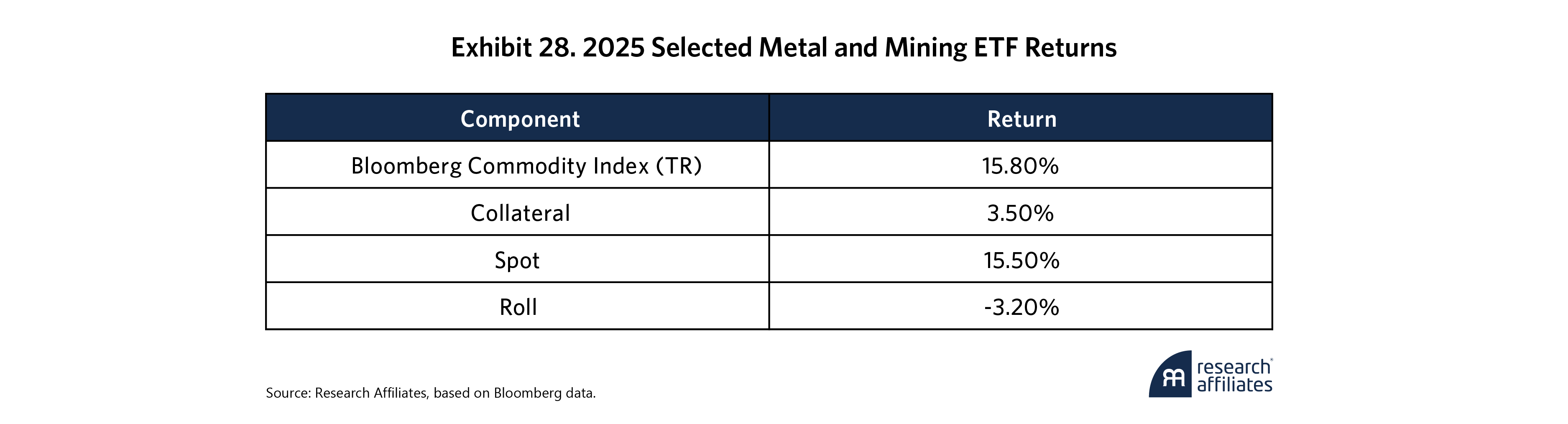 For investors seeking metals exposure outside the futures markets, commodity funds and equities are worth considering. Exhibit 30, Panel B, shows how mining ETFs enjoyed a double tailwind year amid high equity market and robust metals performance. This also indicates these funds can diverge from the underlying metals when equities have significant up or down years.