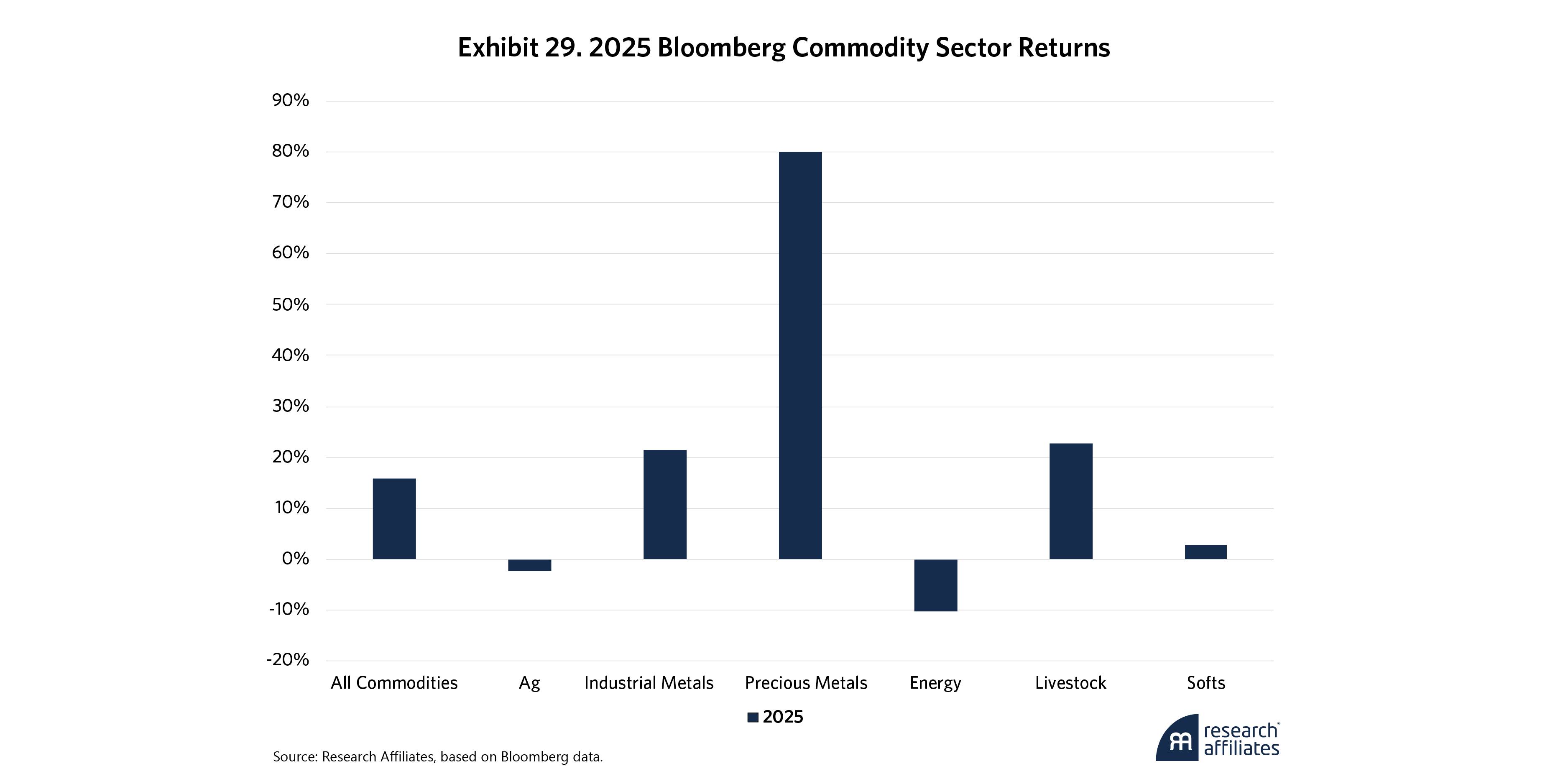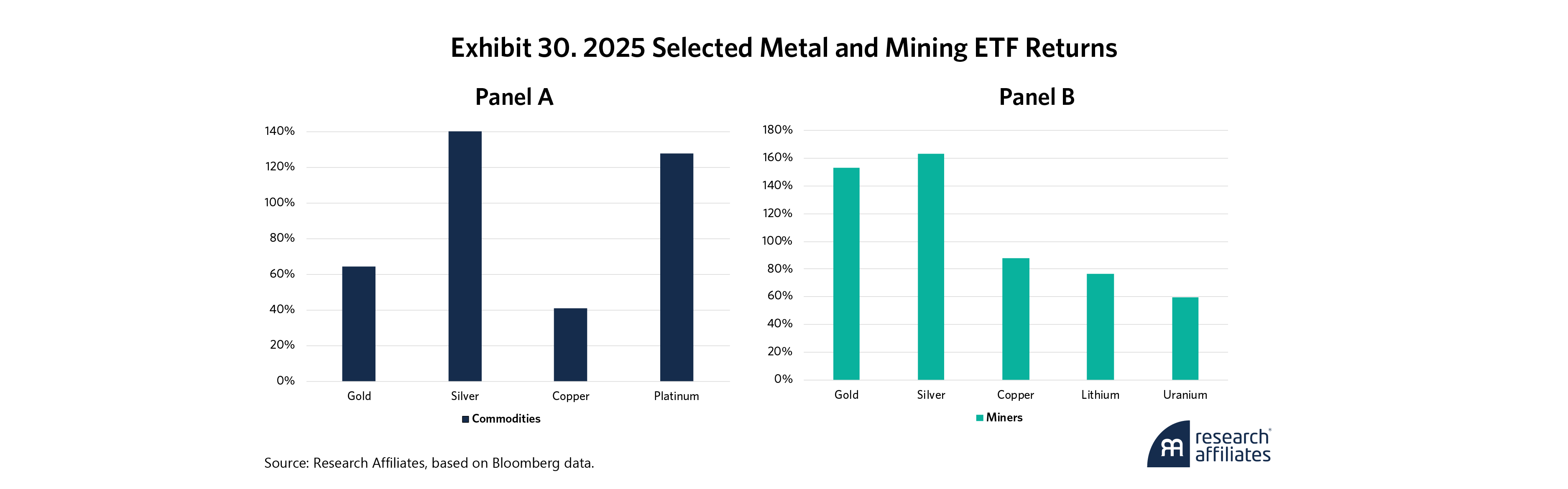 While gold and, to a lesser extent, silver received a lot of attention, platinum outperformed both before a late year silver surge. As Exhibit 30, Panel A, shows, while not a precious metal, copper also had a great 2025 given the uptick in global demand.
