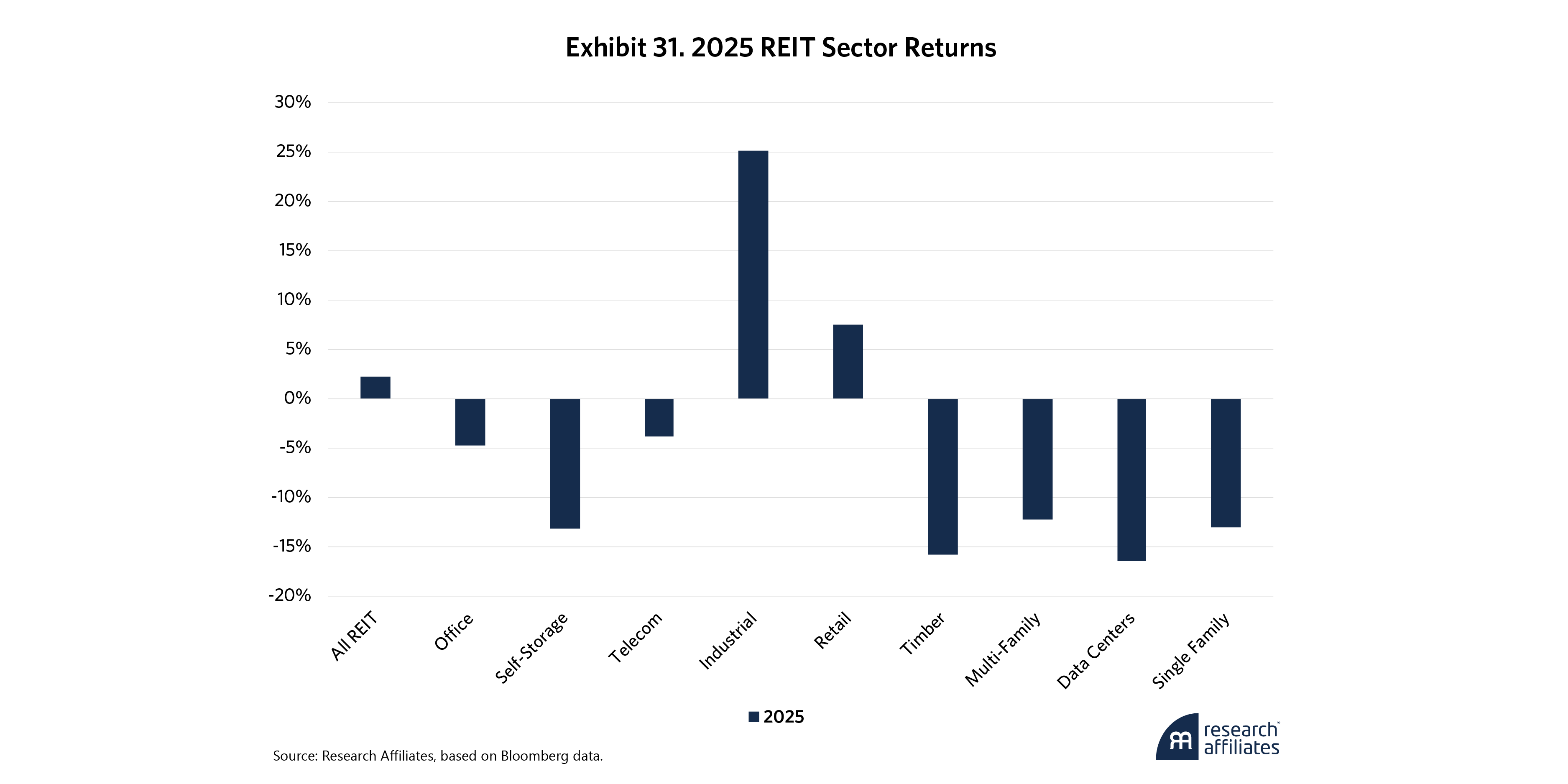 Has any asset class been more disparaged than commercial real estate over the last decade? With the “retail apocalypse” and the work-from-home phenomenon, the sector has seen better days, with such relative newcomers as data centers and telecom among its only bright spots in recent years. However, Exhibit 31 shows those darlings, with their richer valuations, exhibited a pullback in 2025 while industrial and left-for-dead retail rebounded.