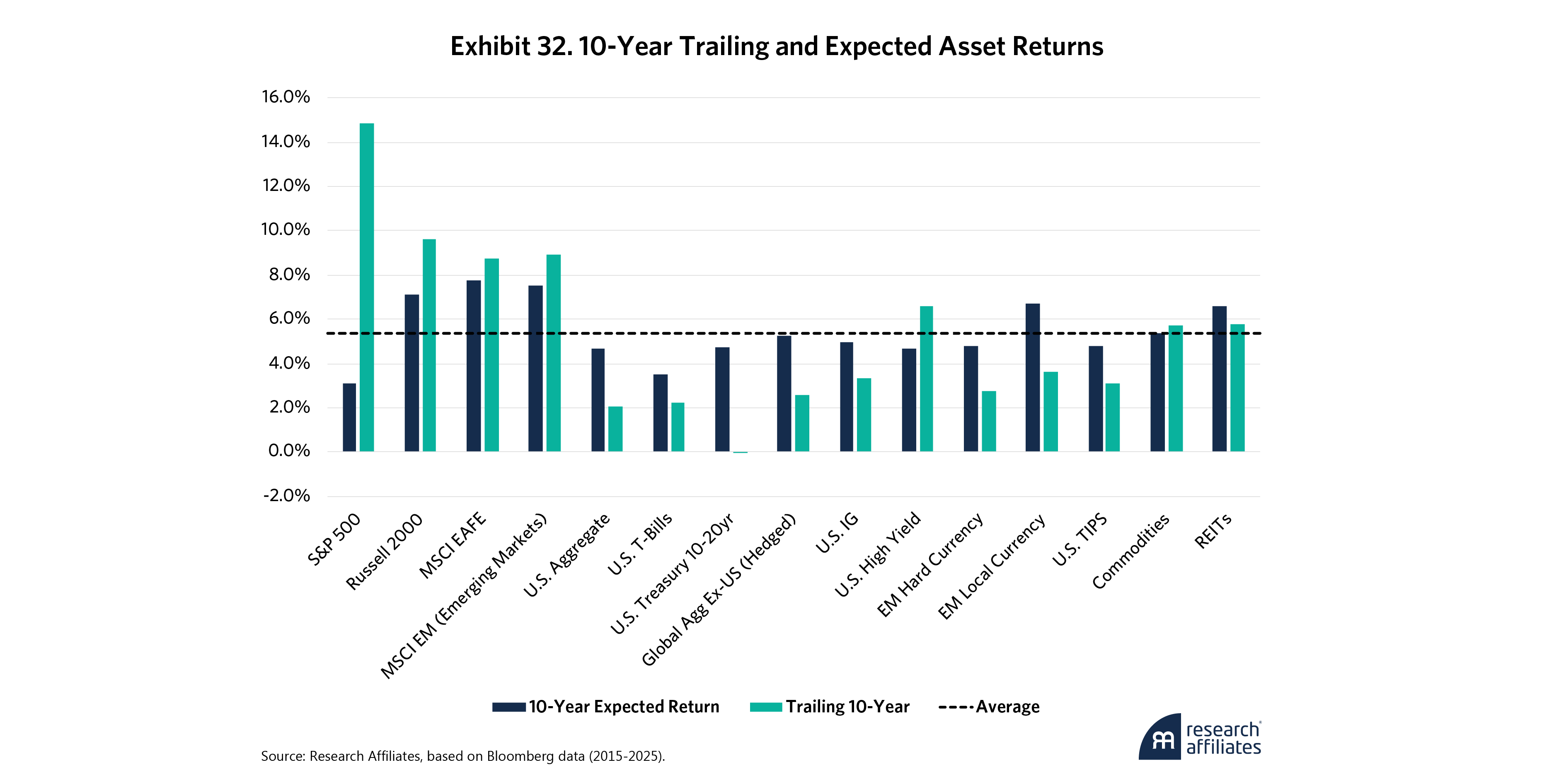 Exhibit 32 shows the high-flying S&P 500, with its expensive multiples, is priced for perfection. That has historically led to poor future returns. By contrast, small caps, non-U.S. stocks, EM local bonds, commodities and REITs are generally priced for continued appreciation.