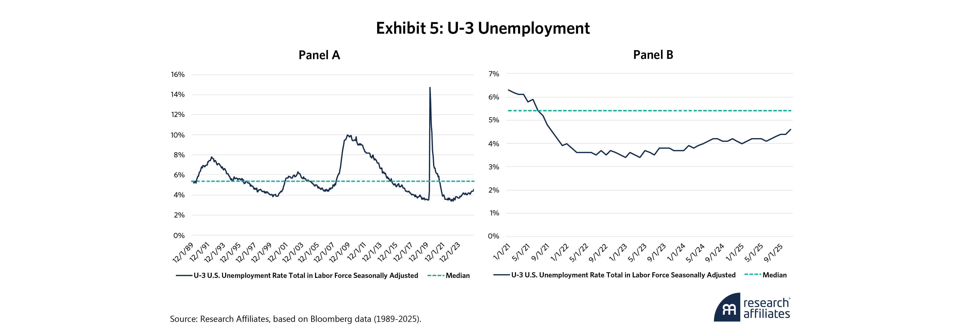 While the labor market has been strong, substantive cracks are beginning to show. Current unemployment is 4.6%, below the 35-year median of 5.4% but up from 3.5% in early 2023, as Exhibit 5, Panel A and Panel B, show. These readings are likely overly optimistic. The annual revision to last year’s net jobs report ending March 2025, for example, revealed an overcount of 911,000 jobs.