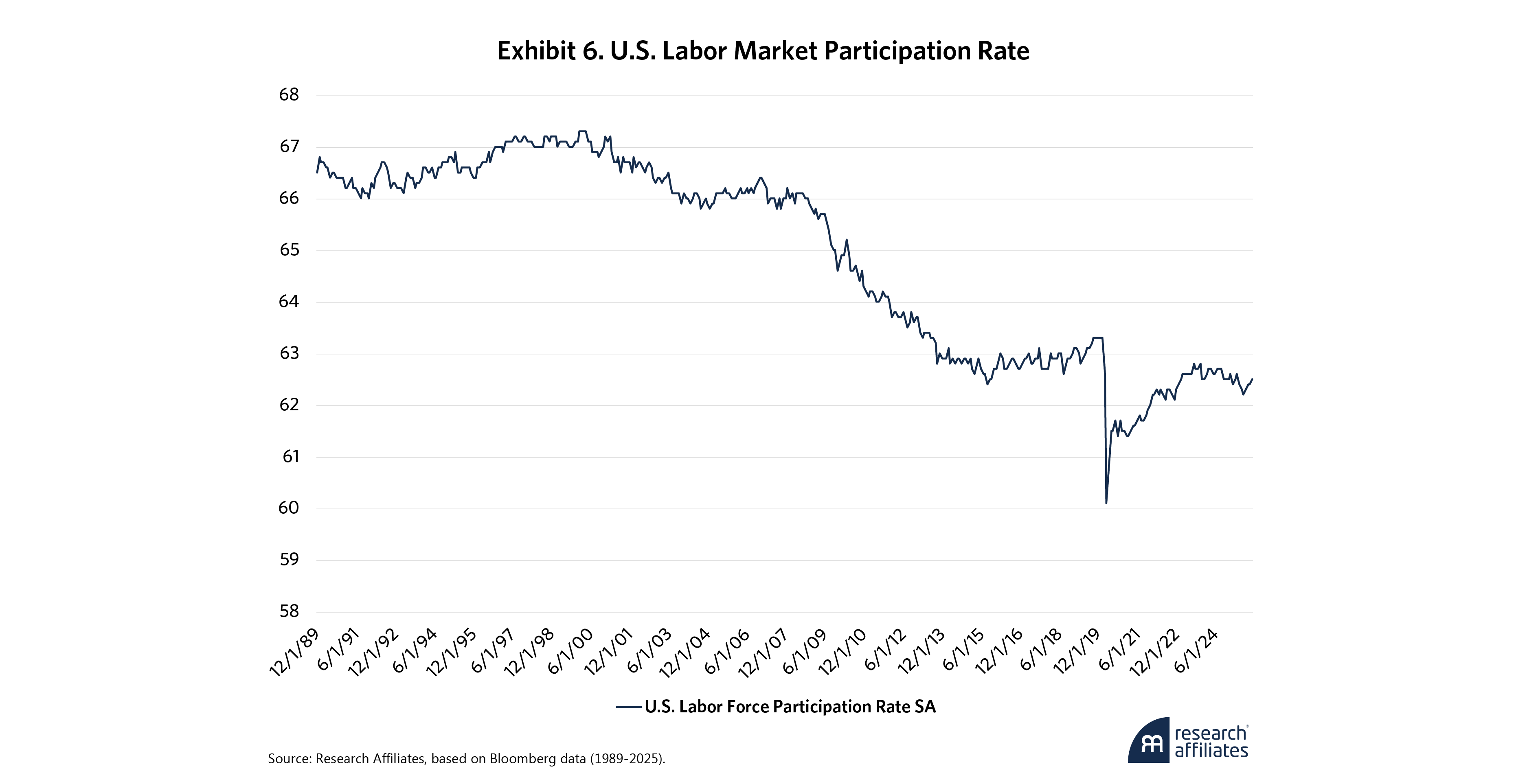 Governments now carry historically high debt-to-GDP ratios and have less fiscal room to respond to shocks. Gross U.S. federal debt exceeds 120% of GDP. Europe and Japan are similarly in the red. Higher interest rates make servicing these debts more challenging. As such, fiscal policy could contribute to, rather than counteract, instability and volatility amid a rapidly changing labor force due to automation, aging demographics and immigration reduction.