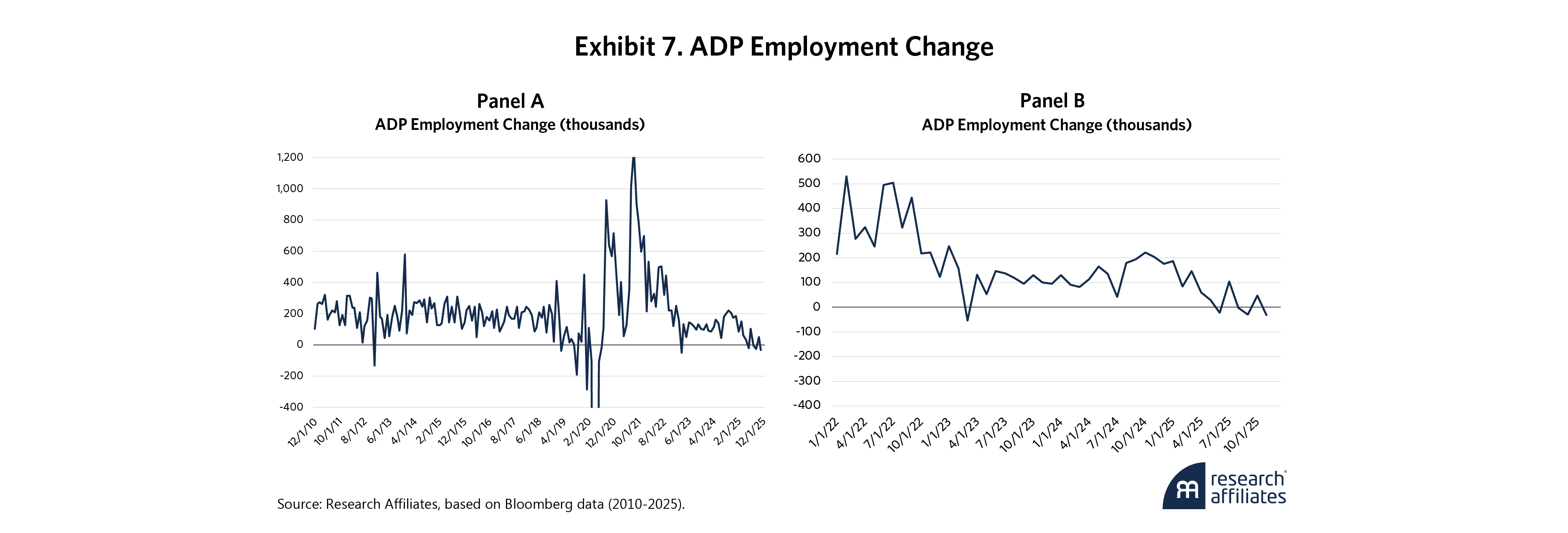 The shutdown of the U.S. federal government during much of the fourth quarter increased reliance on the ADP jobs report. Exhibit 7 shows U.S. private-sector employment fell by about 32,000 jobs in November 2025, below consensus expectations. The decline spanned both goods- and service-producing sectors. The service side, which includes professional and business services, along with information services, was the hardest hit.
