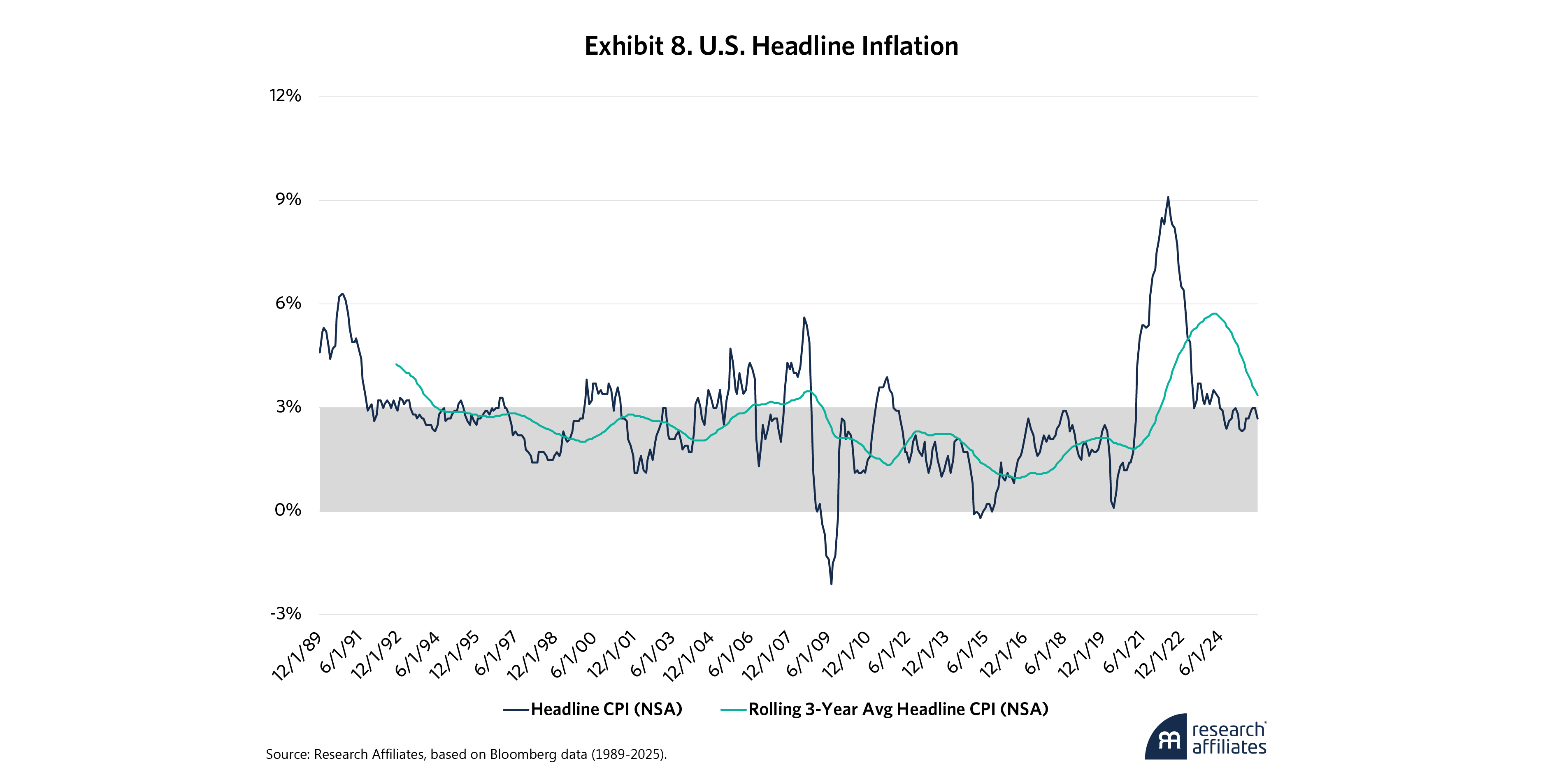 Early in the year, the market perceived 3% inflation prints as problematic but now seems to accept 3% as the norm. For example, the market rallied in October when the September headline inflation print came in below forecasts at 3%, which was not enough to discourage expectations for a Fed rate cut. Exhibit 8 shows headline inflation relative to 3% and that rolling three-year inflation has rarely exceeded 3% over the last 35 years. By 2035, that trend may no longer hold.